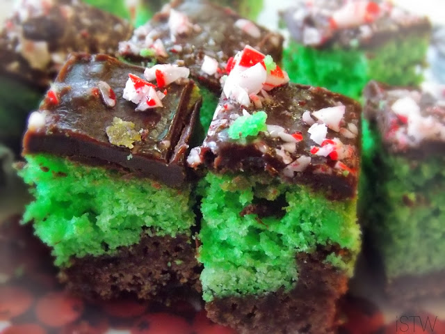 To continue with a fresh batch of batter, carefully spread the green batter evenly over the chocolate batter. Pop it into the preheated oven and bake for 30-35 minutes...
